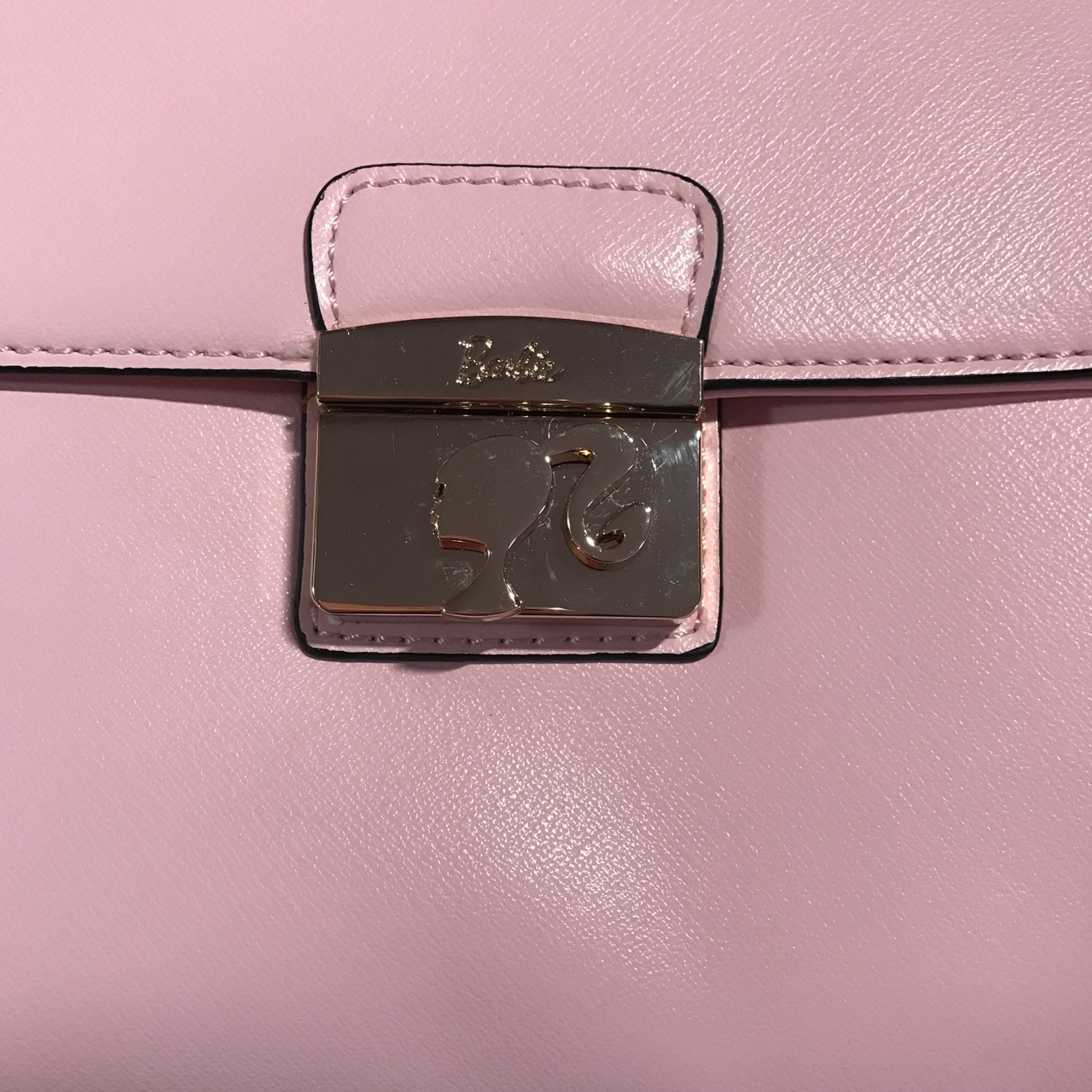 Buckle close up. Barbie cursive logo and silhouette.
