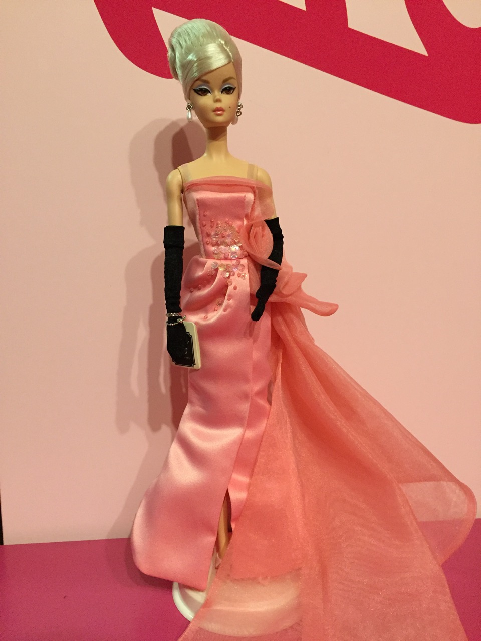 Platinum hair, coral pink satin gown, black opera gloves… totally thumbs up♡♡♡