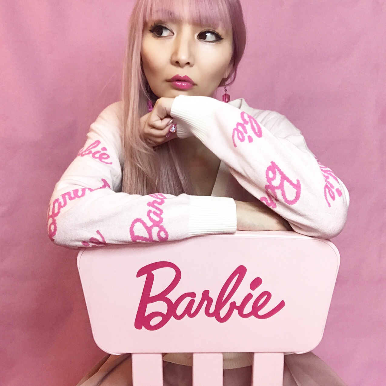 Here’s my OOTD! Sweater is from Barbie Harajuku, skirt is from forever21. The chair is from IKEA and put Barbie decal. It’s for kids but adults still can sit on, and makes your room look more dolly!